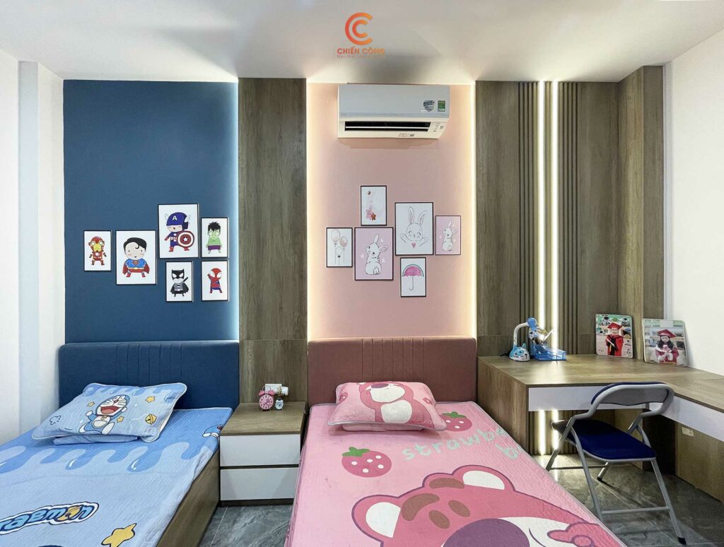 Bằng việc sử dụng hai màu đối lập Xanh và hồng tạo khoảng không gian riêng cho hai bé với 2 giới tính khác nhau ở trong cùng một không gian để hai bé có những trải nghiệm thú vị riêng biệt của mình.