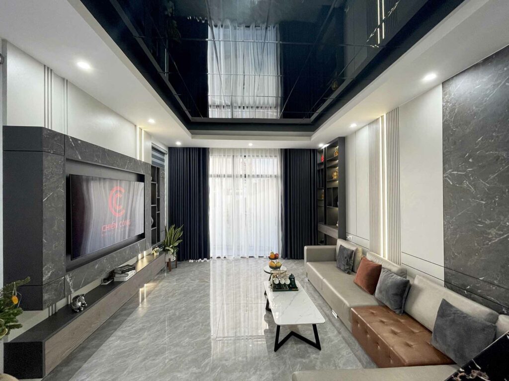 Phòng khách được thiết kế với sự ấm áp và sang trọng, sử dụng nội thất gỗ công nghiệp chất lượng cao của Chiến Công. Màu ghi nhẹ kết hợp với các chi tiết tinh tế, tạo nên không gian thoải mái, phản ánh phong cách sống hiện đại.