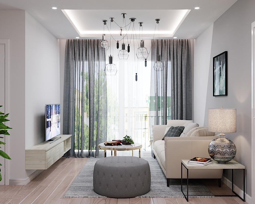 Phòng khách căn hộ được thiết kế tổng thể với gam màu trung tính như trắng, xám nhạt, xanh dương. Toát lên nét đẹp trang nhã, tươi trẻ của phong cách nội thất Scandinavian. Các món đồ sử dụng trong phòng khách đều là các món đồ cơ bản. Như kệ tivi gỗ, bàn trà đôi mặt đá, bàn đơn mặt đá dùng làm kệ để đồ, bộ sofa màu kem. Cùng với một vài chậu cây xanh tạo nên điểm nhấn cho không gian.