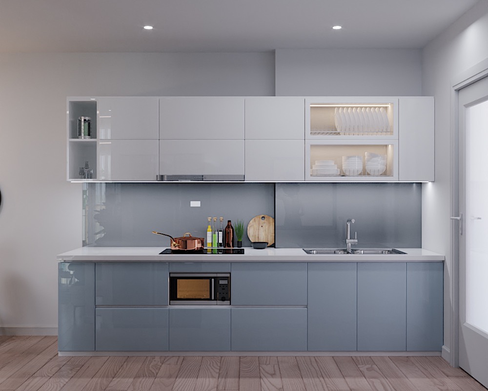 Nối liền phòng khách là khu vực phòng bếp và bàn ghế ăn. Được bố trí gọn gàng, ngăn nắp và có đầy đủ thiết bị tiện nghi. Việc phối hợp sàn gỗ với các họa tiết vân gỗ kết hợp hài hòa với tủ bếp với tông màu trắng xanh làm nổi bật cho không gian nấu nướng của căn hộ này. Ngoài ra gia chủ cũng đặt thêm chậu cây xanh nhỏ giúp không khí được lưu thông.